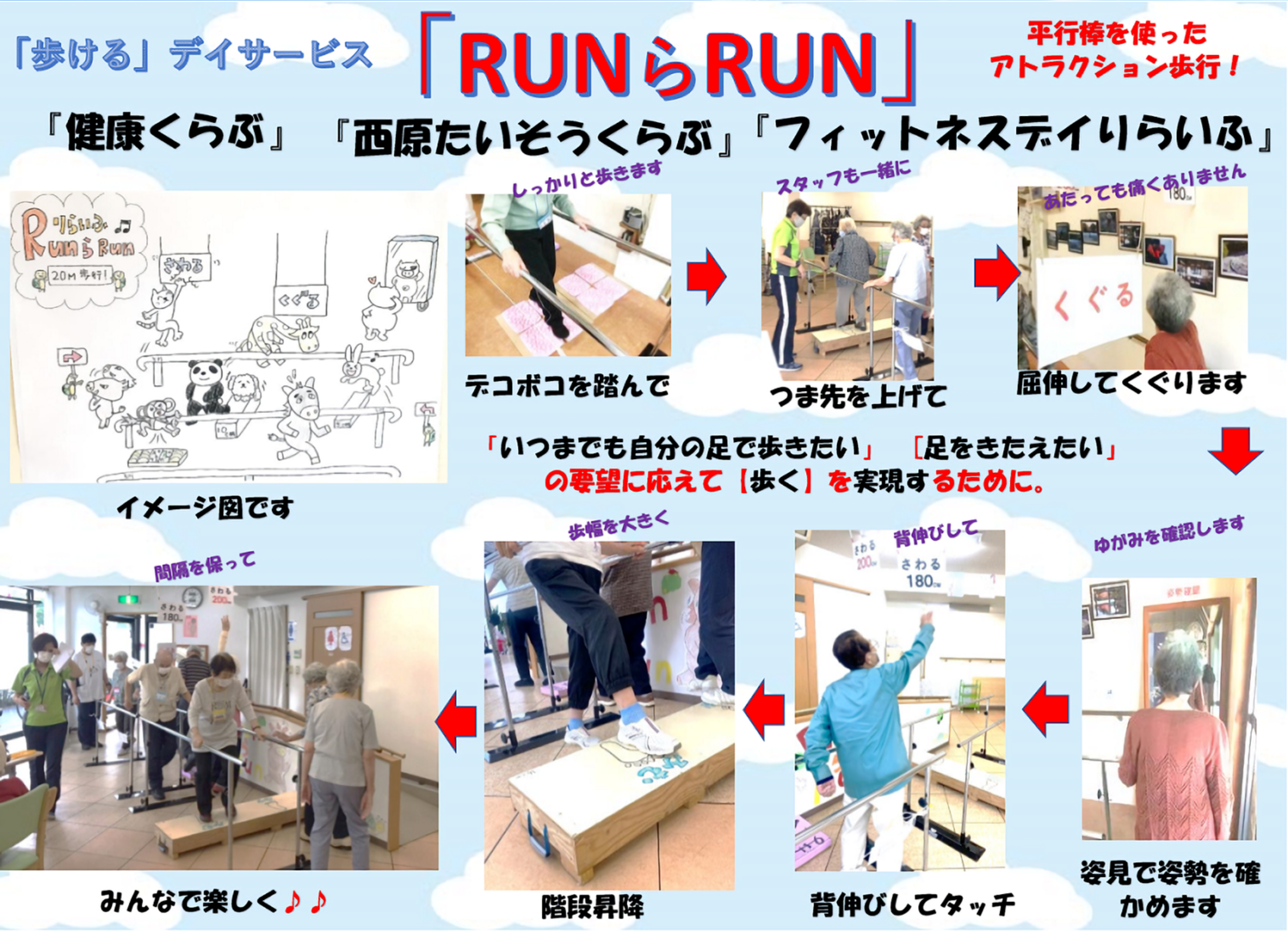 機能訓練に特化した短時間デイサービスを中心に、介護予防の視点に立った専門家のもと、選択できる時間・体力に合わせた個別メニューで自分なりの目標を持って参加できます。
