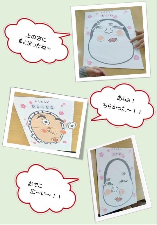 持ち上げてもステキなお顔が崩れないよう、遠くの席の方にも見ていただけるよう、磁石でくっつくように作った職員自慢の福笑いです( ◠‿◠ )