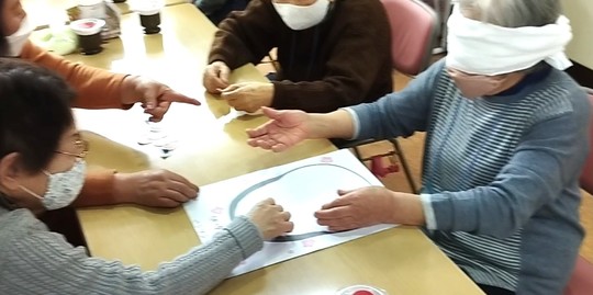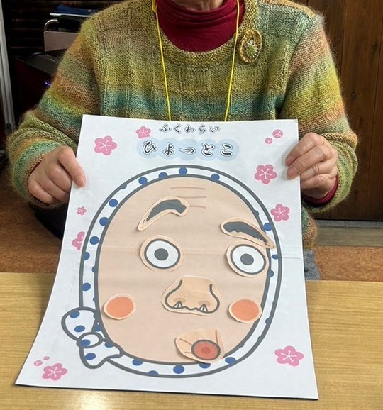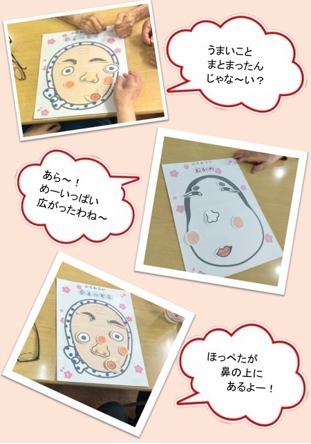 体操の合間のレクリエーションとして、お正月らしく福笑いを行いました。