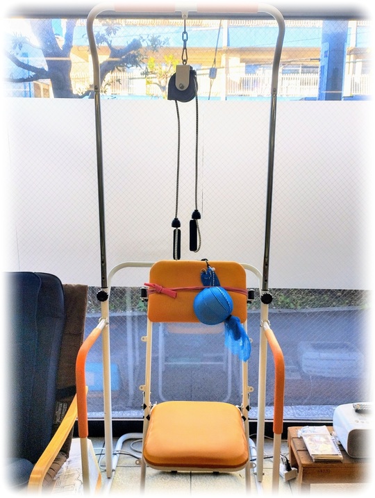 背もたれに置いてあるボールは姿勢強化になります。背中をくっつけないようにしていただくために置いてあります。