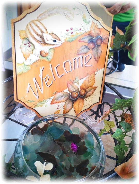 本日のトールペイントは可愛いりすが元気に遊んでいる姿です。目がくるっとしてとても可愛いです。トールペイントの下に置いてある飾りはハンドトリートメントの雰囲気に合わせました☆☆社長の田舎でとれたシーグラスがとっても神秘的にみえます(*^_^*)