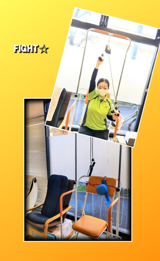 りらいふのマシンについて説明させていただきます♪本日はプーリーです☆☆姿勢を正して行うことで背筋が伸び座位姿勢の矯正や立位姿勢の改善も期待されてます。肩関節周囲炎、いわゆる五十肩などの二次的障害として発症する関節拘縮の予防、脇腹や背中のストレッチにもなります。スタッフも腕を曲げずしっかり上げてトレーニングしています♪