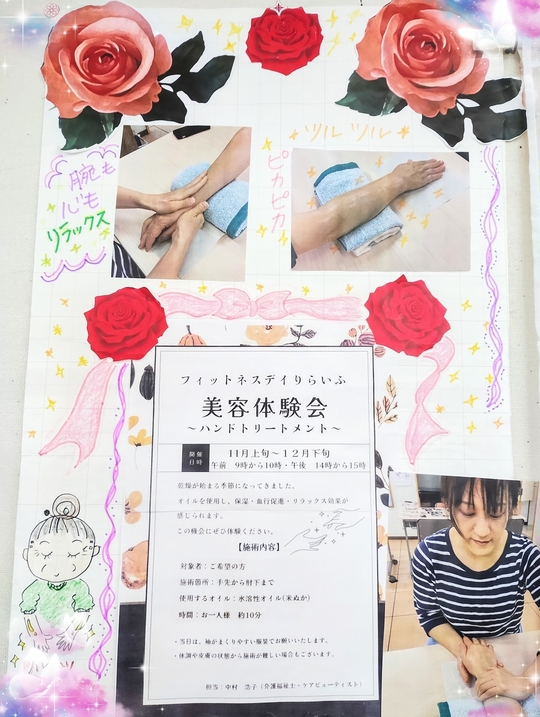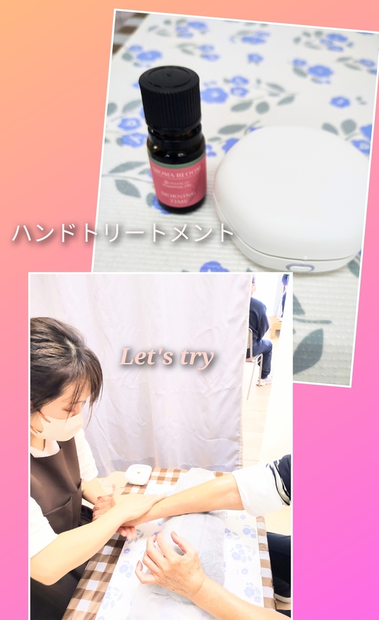 りらいふでハンドトリートメントを開催しました。効果としては保湿☆血行促進☆リラックス効果☆があります。使用したオイルは水溶性オイル(米ぬか)です。アロマではローズマリーとレモンが配合されたオイルを使いました。アロマディフューザーで香りを広げ素敵なお部屋でハンドトリートメントさせていただきました。皆さん「すごく気持ちよかった」「顔もやってほしい」と好評でした。