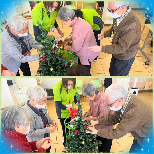 皆さんと一緒にクリスマスツリーを飾りました。「この飾りがいいかしら?!」「あれがいいんじゃない」など皆さんのおかげでとっても素敵なクリスマスツリーの出来上がり☆☆