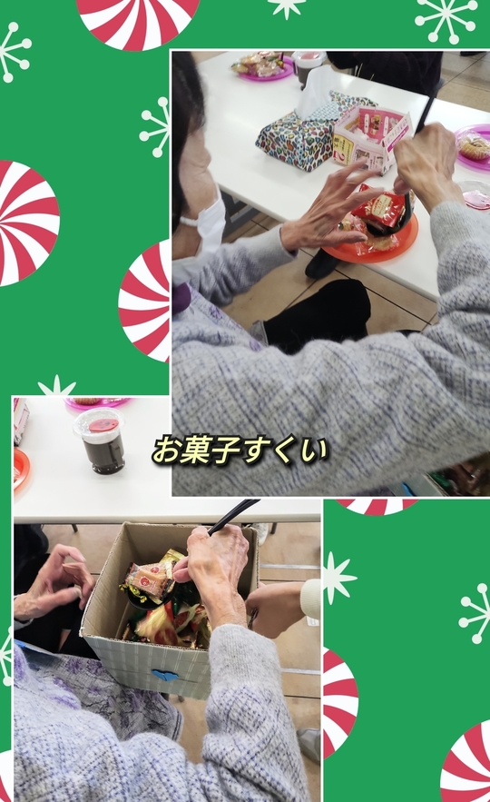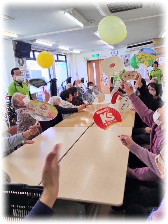 クリスマス会のレクリエーションで「うちわサッカー」をしました。うちわを使って風船をかごに入れるゲームです。皆さん、風船が来ると目を光らせたようにえーいとおもいきりうちわで風船をたたきます。かごに風船が入りそうになるとうちわで阻止し(ディフェンス)上手にプレーしていました。とっても盛り上がりいい運動になりました。