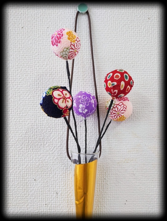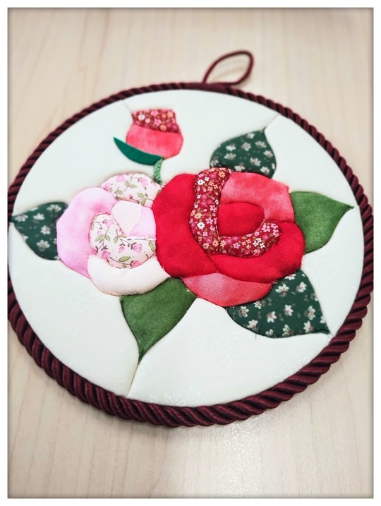 利用者さんが素敵な作品持ってきてくれました。可愛い『つばき』の花です。生地は着物などでできていて赤とピンク、色とりどりでとてもかわいいです☆(●ˇ∀ˇ●)