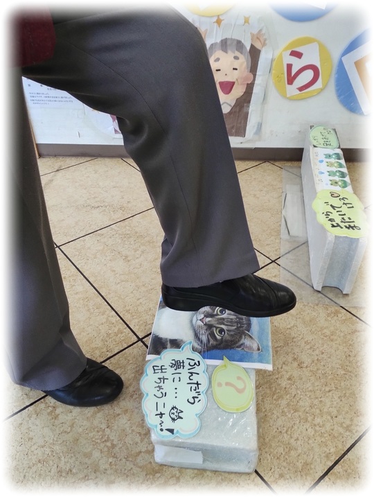 踏んだら夢に出ちゃうニャーの障害物☆☆皆さんしっかり足を上げてまたいでくれています。3周をメインに歩いていただいていますが疲れた~~と言いつつあと1周!!と頑張っている利用者さんもいます(⋈◍>◡<◍)。✧♡