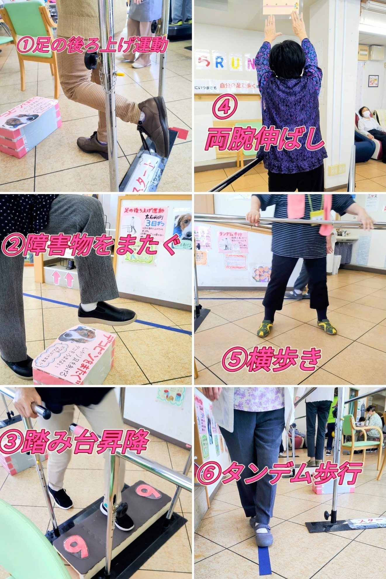 ⑥タンデム歩行→一方の足のつま先にもう一方の足の踵をつけます。一本の線の上を綱渡りのように歩く、バランス感覚を鍛える訓練。(手すりを持ってやっていただいてOKです)