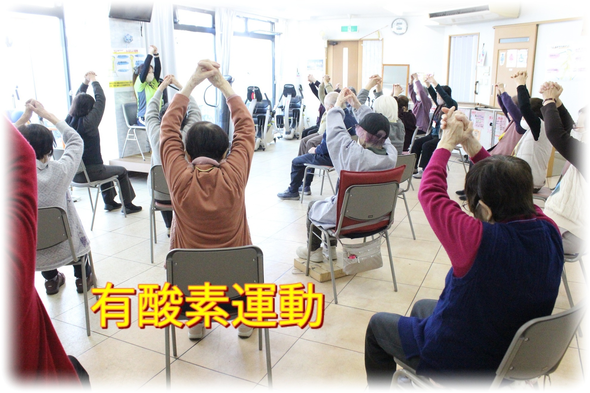 有酸素運動では10分間音楽に合わせ身体を動かし続ける人気の運動になります。(❁´◡`❁)フィットネスデイりらいふの有酸素運動の始めの動きは、つまさき・かかとになります。皆さん意識をしてあげています☆☆有酸素運動の効果としては身体機能の維持心肺機能の活性化運動の継続  などがあります無理なく楽しい運動になっています。皆さん、音楽に合わせバンザイ運動o(*^@^*)oとっても上手にあげています。