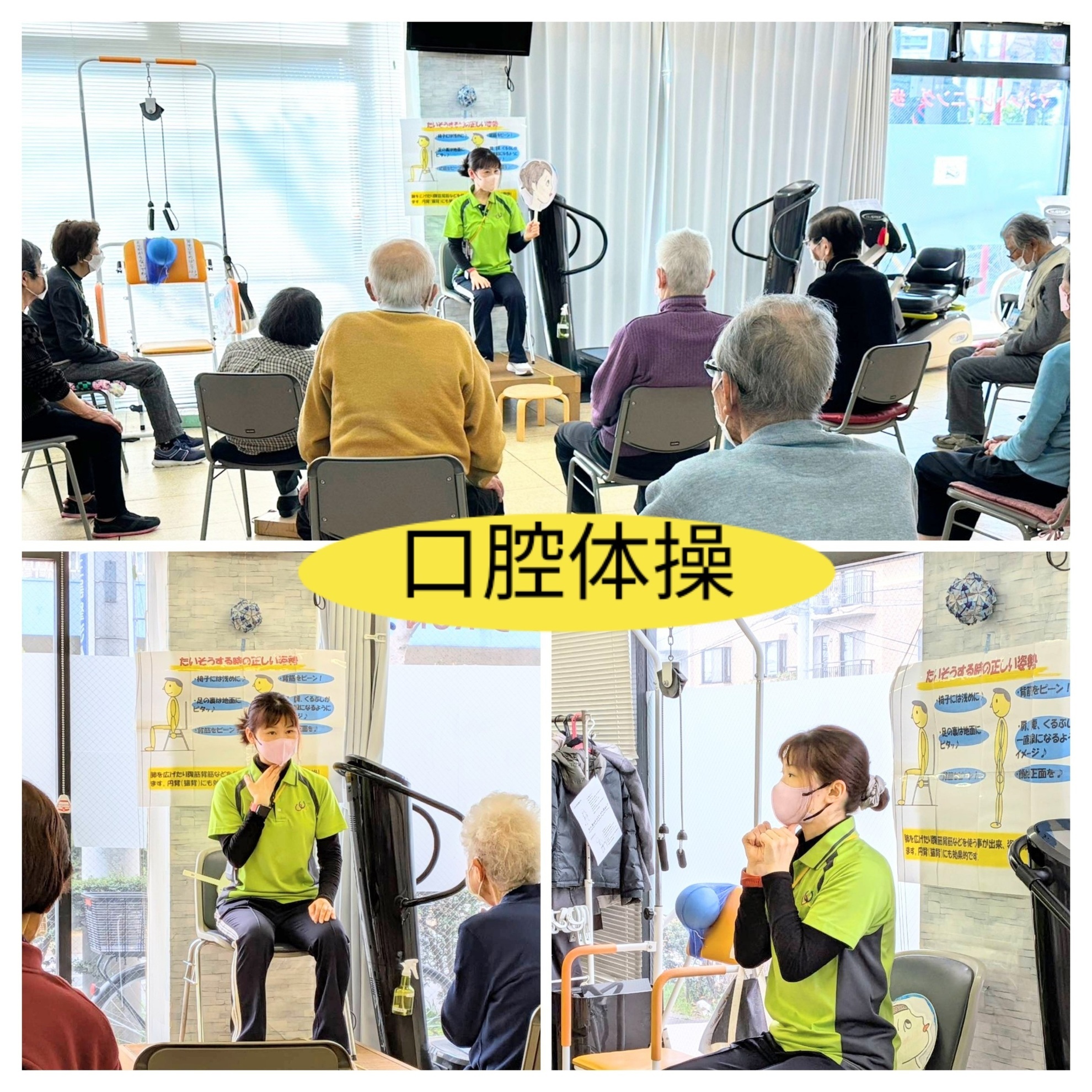 こちらは整理体操の一部です。首回りやリンパをほぐしたりバンザイ運動などゆっくり身体をほぐしていただいていますこれから暖かくなってかわいいお花達も咲くので楽しみですね皆さん身体に気を付けてお過ごし下さいね(*^_^*)